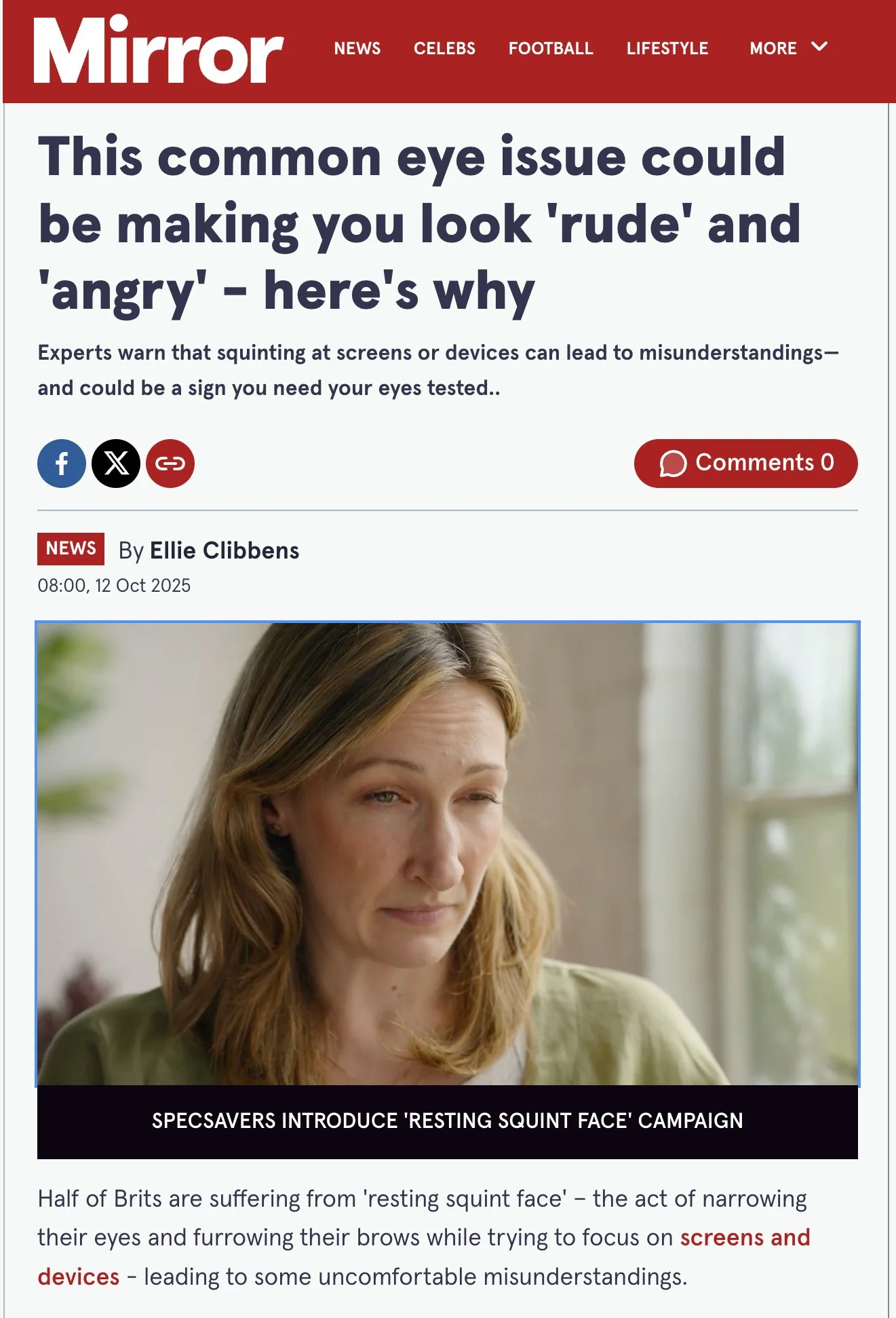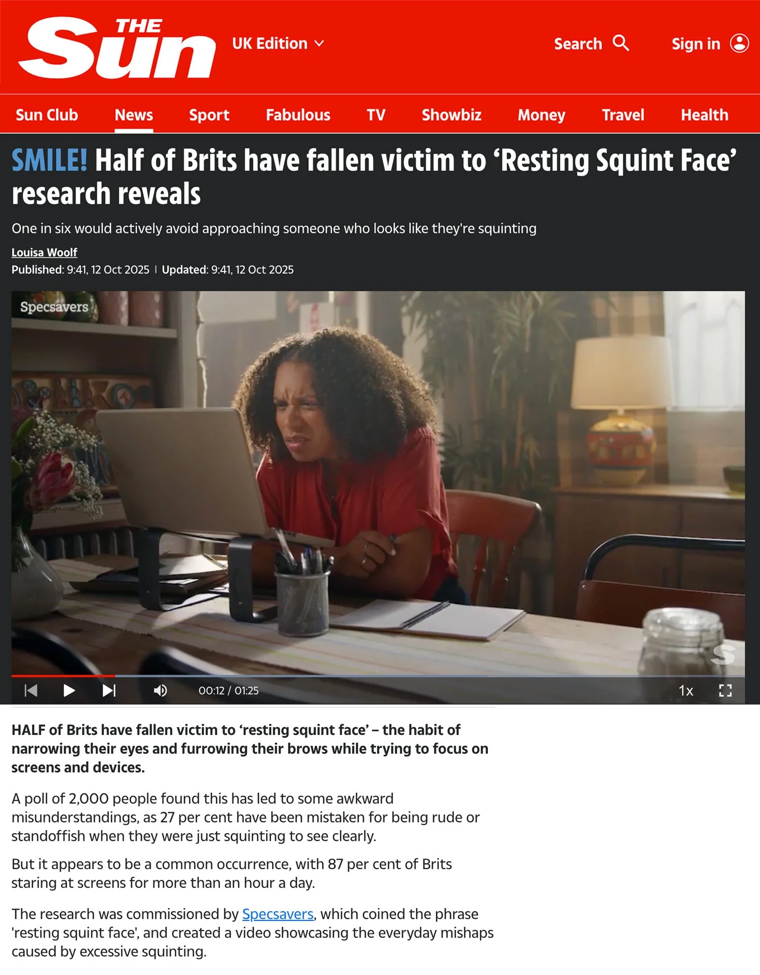 Millions of people squint at their devices – a symptom of presbyopia. Only 27% of Brits have heard of it and most don't realise they squint. This absurd PSA asks loved ones to stage a squintervention.